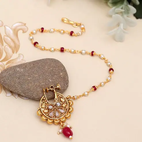 Kundan & Beads Nose Nath with Chain – Gold Plated